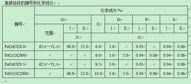 產品概述:        高碳鉻鐵主要用于不銹鋼生產,其中200系不銹鋼含鉻量約在16%,300系不銹鋼含鉻量約在25%,400系不銹鋼含鉻量約在14%