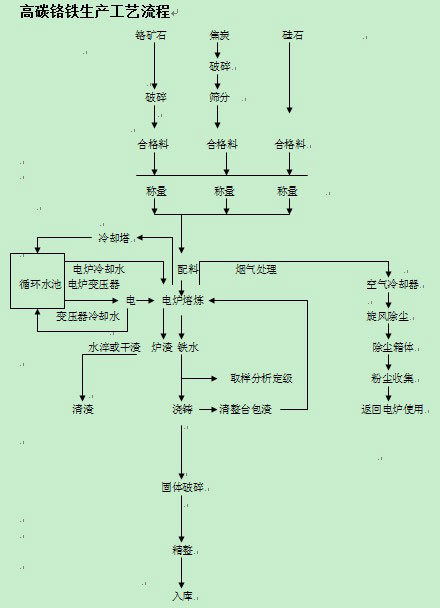 高碳鉻鐵的冶煉方法有高爐法、電爐法、等離子爐法等。使用高爐只能制得含鉻在30%左右得特種生鐵。截至2012年,含鉻高的高碳鉻鐵大都采用熔劑法在礦熱爐內冶煉。